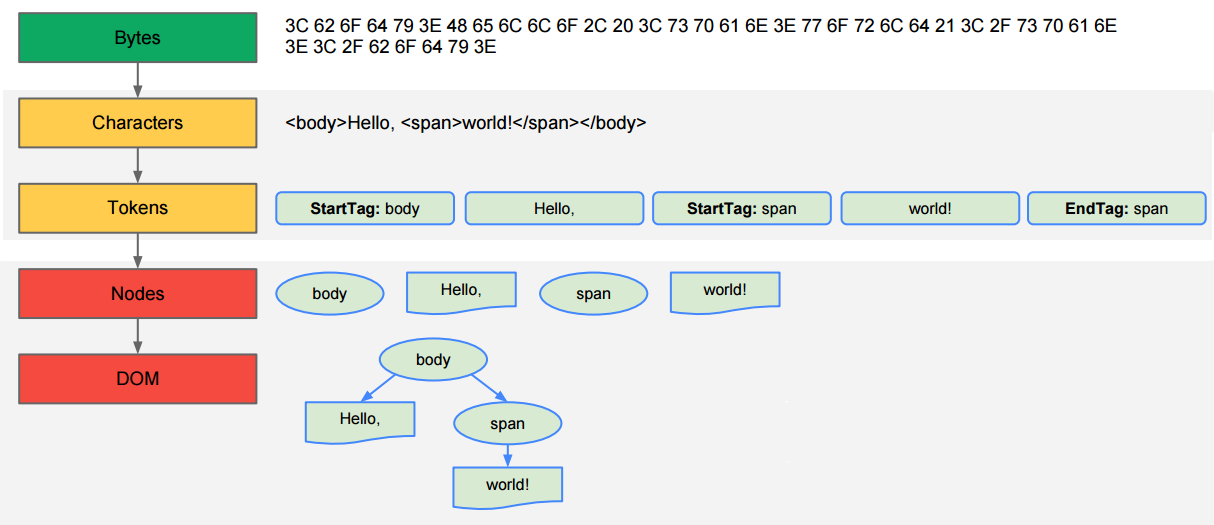 - Characters -> Tokens : HTML파일은 토큰으로 변환된다. <div>, <a> 등의 다양한 태그와 콘텐츠(태그 내부 내용), 주석 등을 역할에 따라 구문 단위로 분해하는 과정이다.
